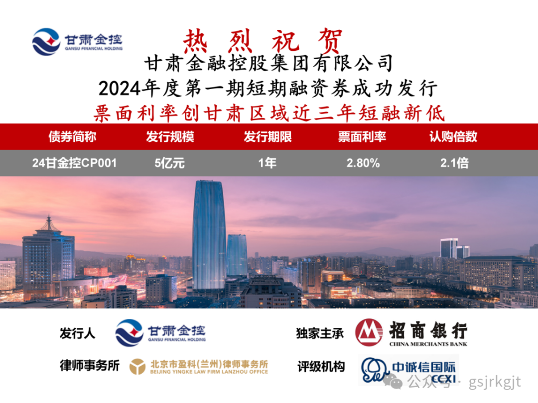 2024年2月6日,博鱼网页版成功发行2024年度第一期短期融资券,发行规模5亿元,债券期限一年,票面利率2.80%,债券票面利率创甘肃区域近三年同品种债券利率新低。