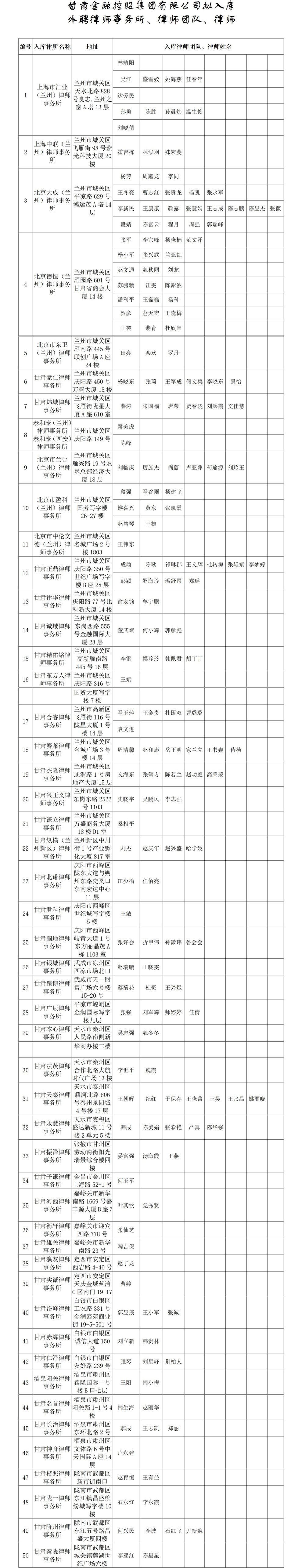根据《博鱼网页版外聘律师管理办法》(甘金控〔2025〕100号)相关规定,为规范集团外聘律师管理,优化法律服务质量,经前期各部门、各子公司推荐、合规风控部(法律事务部)资格初审、律师库评选组综合评议等程序,现将拟纳入集团外聘律师资源库的律师事务所、律师团队及律师名单予以公示。(名单附后)